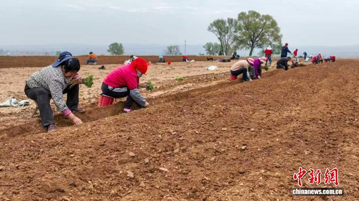山西省长治市屯留区河神庙乡范家沟村,村民们正弯腰开沟、放苗覆土,一株株党参苗被小心栽入田间。李红卫 摄
