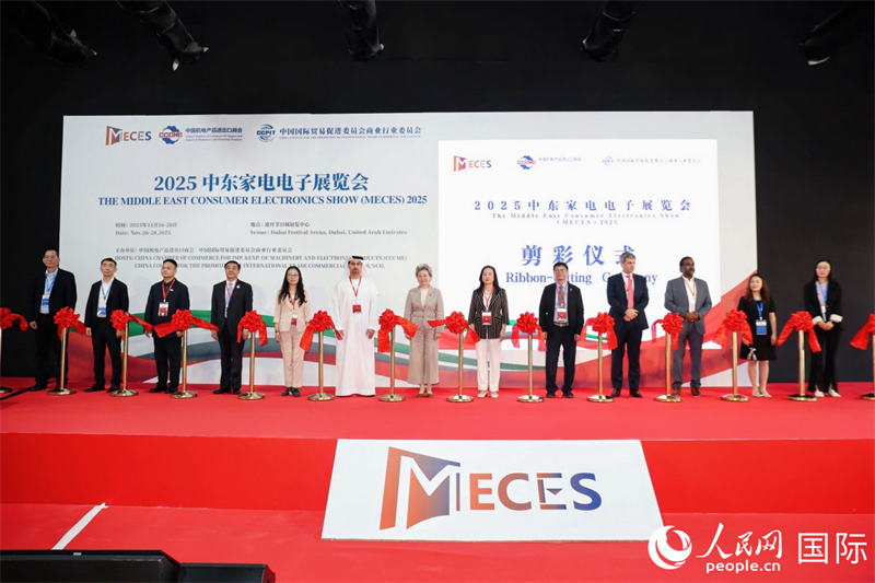 人民网迪拜11月27日电(记者管克江)2025中东家电电子展览会及“中国贸促”(中东)绿色和创新合作展览会26日在迪拜节日城展馆开幕,展会共吸引来自中国的300余家企业参展参会。剪彩仪式。主办方供图中