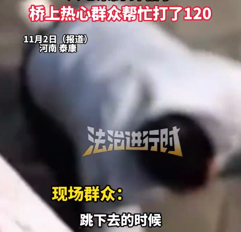 11月2日,河南。一男子开车门跳桥,不小心跳到岸边桥下的水泥地板上。现场群众:“男子拉开车门就往下跳,可能是没看桥下水在哪个地方?桥挺高得有六七米高,男子摔懵了。”桥上热心群众帮忙打了120。...