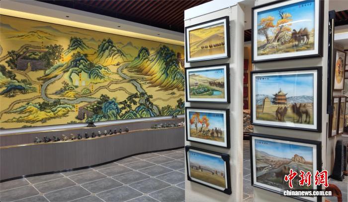 图为嘉峪关关城脚下的一文创产品基地内,由颜色各异的戈壁碎石与大漠沙砾制作而成的风雨雕石艺画琳琅满目。高莹 摄